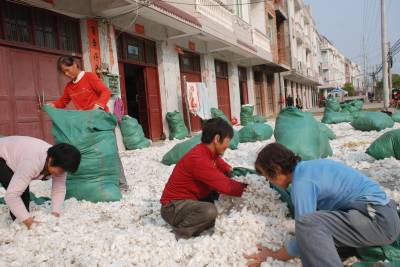 11月9日,汉川市田二河镇燕子村村民把晒好的棉花装袋进行销售。今年,该镇棉花获得丰收,产量达9万斤。汉川纺织企业众多,棉花的需求很大,棉农们足不出户就能卖个好价钱。