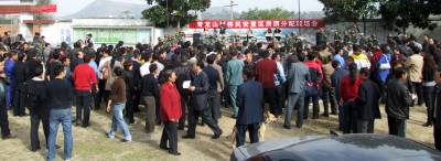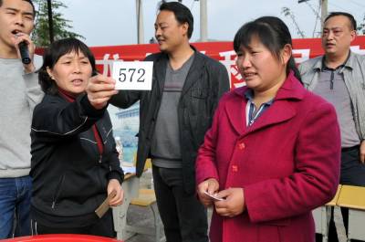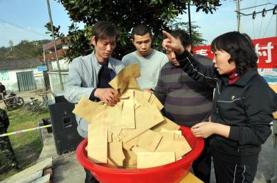 11月10日下午2:30分,湖北省郧县柳陂镇青龙山村移民安置区房屋分配现场会在村小学操场举行。青龙山村共有145户596人外迁,负责人宣布会场纪律,并选出6名监督代表上台监督抓阄分新房整个过程和细节,2名公证员展示密封档案袋,右面公证员将档案袋里写有户主姓名的密封小信封倒入大塑料盆内,左面的公证员将档案袋里写有移民安置区新房编号的密封小信封也倒入自己面前的大塑料盆内,右面监督代表在盆内随意抽出一个小信封交给公证员,公证员打开信封宣布户主姓名,移民户主上台领名单后到左面盆内抓起一个信封交给公证员,公证员打开信封拿出新房编号向台下移民展示并宣布所抓阄号编,抓阄户主在登记员处进行登记签名和按手印确认,一户外迁移民抓阄分新房工作结束。下午该村第一批抓阄分房为三层,外迁村民涂学强的妻子为第一个抓阄人,她抓得572号新楼房是靠近广场边上的,这让她高兴的不得了,整个抓阄分新房只用了50分钟,9日兴盛村也完成了286户1148人外迁移民抓阄分新房工作。11月12日郧县因南水北调中线工程最大一批431户1744人的柳陂兴盛村和青龙山村外迁移民将搬迁到潜江市广华农场六中队安置地开始新的生活。图1为外迁移民在村小学操场参加抓阄分新房现场会时的情景。图2为监督代表将房号信封搅乱时的情景。图3为负责人用喇叭喊抽中户主上台抓阄时的情景。图4为涂学强的妻子抓得572号新楼房时的情景。图5为涂学强的妻子在登记签名和按手印确认时的情景。周家山杨文华摄湖北省郧县城管大队电话13872840078邮编442500
