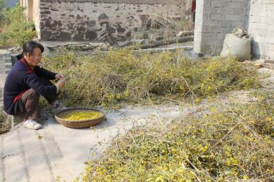 以野菊作枕,有助于治疗失眠、目赤、头晕、高血压等症。孝昌县小河镇不少农民将田边地角的野菊花割回凉干后再采摘,卖给药枕加工企业,每公斤可创收15元。11月10日上午,小河镇红河村6组54岁村民汪春蓉边采摘野菊花边微笑着说:”这个月仅此一项,增加1500元的收入应该没有问题。”宋俊初摄