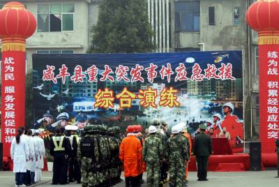 11月9日,咸丰县公安武警消防在县中等职业技术学校内联合举行应急救援综合演练。县防汛抗旱、森林消防、医疗救护等13支专业应急救援队和县卫生局、县职校等20多家单位领导应邀现场观摩,县城区各大超市、宾馆工作人员和在校学生、周边市民等近3000余人在现场观看了应急疏散、灭火救援、矿山救护、交通事故救援、反劫持人质演练。综合演练贴近实战,展示了公安武警消防力量整合和整体联动,提升政法队伍维护社会稳定和应急处突能力,充分体现公安武警消防队伍的综合素质和业务能力,展示了公安武警消防昂扬的斗志和优良的作风。咸丰公安:金国民黄泳15335812887