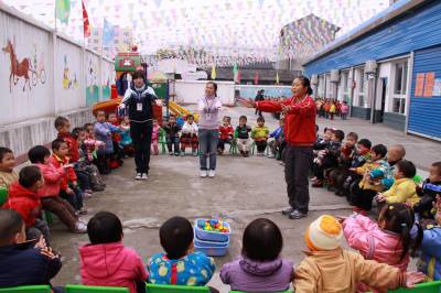 让更多孩子享受优质学前教育(图文)竹山县宝丰镇中心学校朱本双电话:13177481456邮编:442213电子信箱:zsbfzbs@126.com11月11日,竹山县宝丰镇童星双语幼儿园的老师正在指导孩子做游戏。近年来,竹山县宝丰镇确立”让更多孩子享受优质学前教育”目标,因地制宜,努力构建和谐有序的学前教育运行机制。据统计,2010年秋,宝丰镇有各级各类幼儿园8所,其中公办幼儿园1所,民办幼儿园7所;在园幼儿共1026人,教职工67人,其中专任教师54人。学前三年入园率均超过75%。学前教育进入科学、健康、持续发展的良性循环。