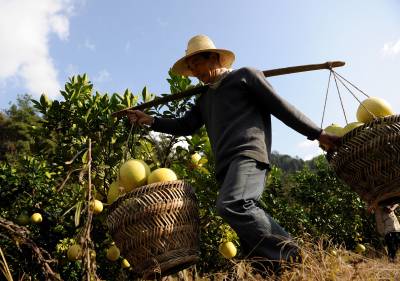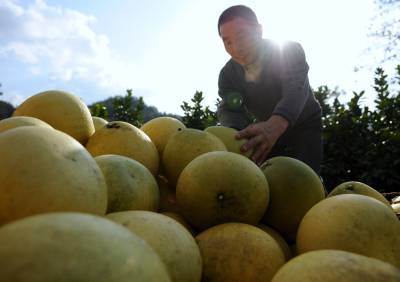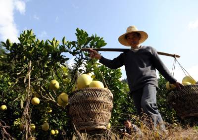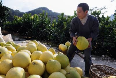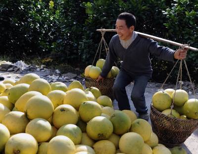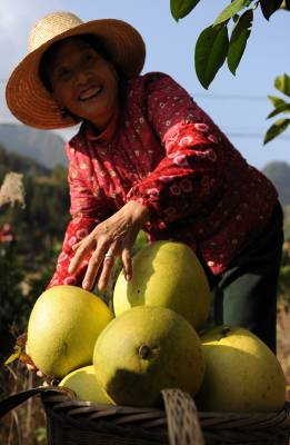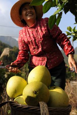 11日,宣恩县高罗乡黄家河村村民在采收贡水白柚。在当地,贡水白柚价格已达到5-9元一个,每亩丰产柚园收入达500元以上。而该县结合产业结构调整,在林业部门”退耕还林”政策帮扶下,已在高罗、沙道沟、李家河等乡镇发展”贡水白柚”基地近8万亩,目前有4万亩已进入采收期,白机种植已逐步成为农民收入的主要来源。