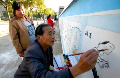 为丰富农村文化生活,云梦县倒店乡组织书画爱好者和民间艺人,在全乡各村组绘制廉政文化漫画或计划生育等公益宣传画画廊。图为11月8日,该乡民间艺人在绘制廉政幽默画。签约摄影师匡文杰摄