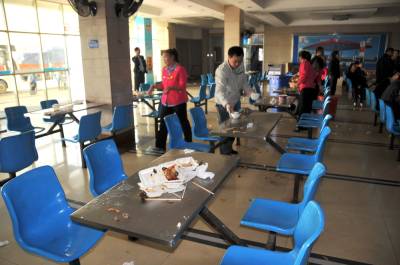11月12日,湖北省郧县因南水北调中线工程客运430户1729名外迁移民至潜江市广华农场后返回郧县,下午2点钟在途中按照与荆门高速公路服务区餐厅预约的中午快餐饭,大小70多辆客车驶进了荆门高速公路服务区,结果只有200多名乘警,卫生员,车长,正驾,副驾和工作人员吃上了午饭,还有200多人和民兵应急分队没有饭吃,理论结果解决不了,随后一部分转道宜城高速公路服务区吃饭,一部分转道襄樊市钟岗服务区吃午饭,还有一部分饿着肚子回郧县,荆门高速公路服务区餐厅没按预约提供中午快餐饭的作法实在让人心寒。图为下午3:08分部分没吃上午饭的工作人员侯在餐厅外气的不得了时的情景。周家山摄湖北省郧县城管大队电话13872840078邮编442500