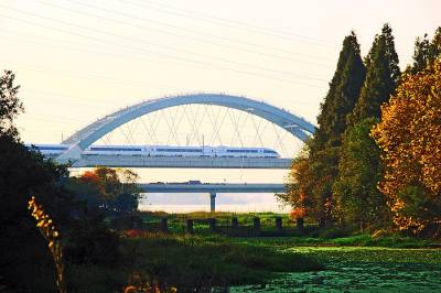 武广高铁凌空飞架东湖湖畔,让广东、湖南的旅客还未下火车就能一睹武汉东湖迤逦的风光美景,而这一段高铁一举成为东湖新的标志性人文景观。