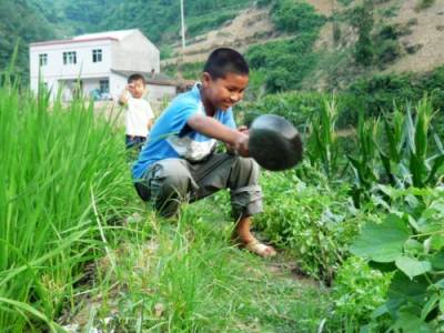 吴金海,14岁,郧县五峰乡大石沟村留守儿童。吴金海3岁时,父母就双双出门,常年在十堰打工,只在年节偶尔回家一次。家里留下肢体残疾的奶奶和偶尔出门打工的爷爷。现在,吴金海的弟弟也有4岁了。懂事早、在十堰城区读书的吴金海利用节假日回家,帮奶奶做事、看家、带弟弟。这组图片是吴金海夏季帮奶奶抗旱浇菜的情景。