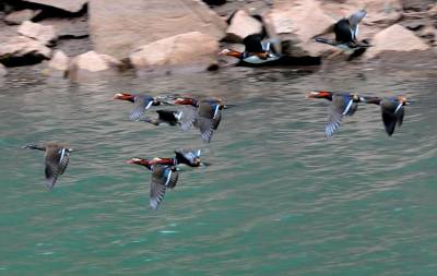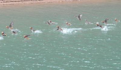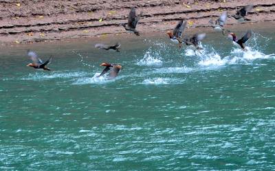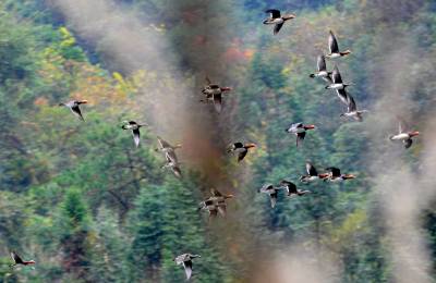 11月14日,成群结队的野生鸳鸯在湖北省南漳县东巩镇昌集村的漳河上飞舞。随着天然林保护工程深入,襄樊市山区的环境日益改善,逐渐有越来越多的野生鸳鸯到襄樊越冬。