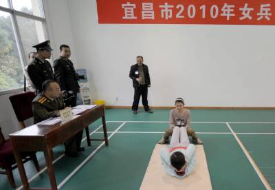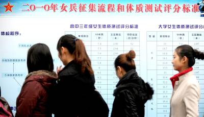 16日,宜昌市2010年女兵征集体检开始,众多年轻女孩来到军分区报名参军,接受祖国的挑选。当天上午,132名应征女青年昨日接受初检,其中69人为应届大学毕业生,初检将体能测试取代过去的才艺表演。记者刘曙松摄