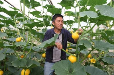 寿光蔬菜在钟祥开花结果钟祥市柴湖镇四新村在外创业的村民赵平杰致富后,今年4月回村联合自家兄弟在村里承包100亩土地,利用山东寿光鲁伯特蔬菜种植技术和产销渠道,聘请寿光农艺师常驻钟祥基地指导种产销。目前,该基地24个蔬菜大棚生长的黄金小南瓜、黄瓜等多个寿光瓜菜品种上市后十分俏销。图为赵平杰在基地为黄金瓜固架牵藤。(赵云福摄)