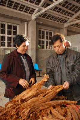 11月16日,五峰土家族自治县烟叶技术人员正在对烟农交售的烟叶进行等级评定。入冬以来,五峰土家族烟农抢抓晴好天气售烟。五峰烟叶常年种植面积达3.5万亩,是全国唯一的马里兰烟叶基地,烟叶常年产量达12万担,每年为烟农提供近8000万元的现金收入,烟叶成为五峰农民增收的支柱产业。