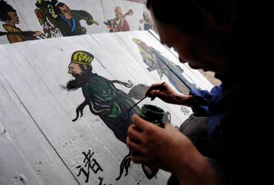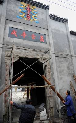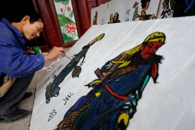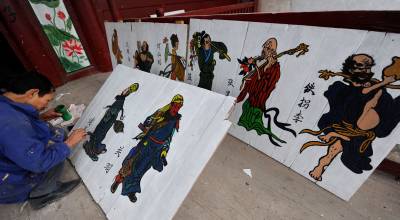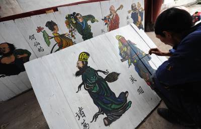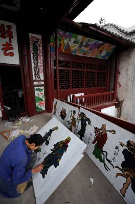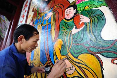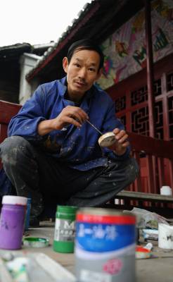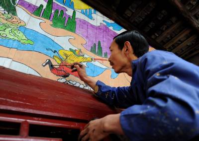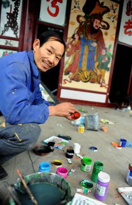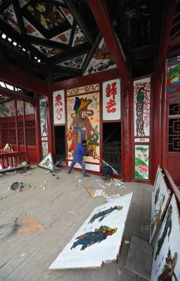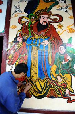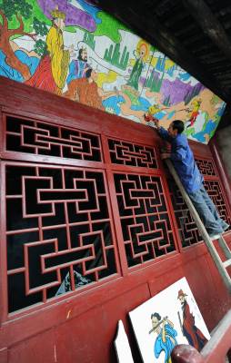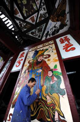 11月17日,宣恩县晓关侗族乡大岩坝村一组农民乾代寿在禹王宫修复现场绘画诸葛亮、关羽等历史人物。从未参加过专业训练的农民乾代寿自幼爱好画画,最擅长刻画传说中的历史、神话人物,成为远近闻名的”草根画家”,20多年来多次主持、参与湖北、湖南、重庆等古建筑修复的绘画工作。本报视界网宋文、熊茂平摄