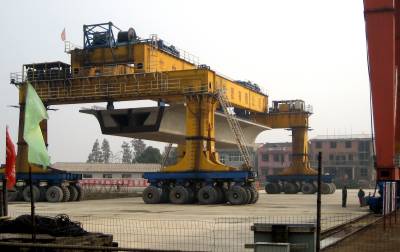 11月17日,在武黄高铁鄂州段的施工现场,一辆起重重量达1000吨的龙门起重吊车正在把一片重量达9000吨的厢梁吊往桥墩上。这种重型吊车专门把在地面浇筑好的厢梁吊往桥墩上,形成高架桥。国产的龙门吊车价格低,起重重量大,维修方便,是高铁建设中的好帮手,大大提高了建设速度。