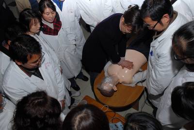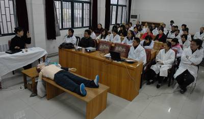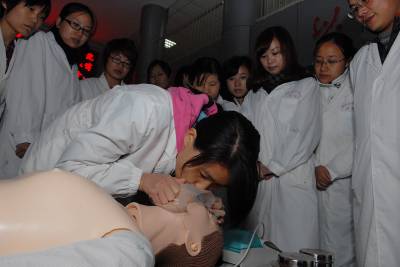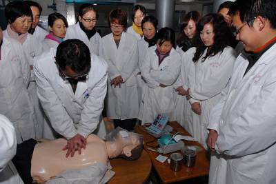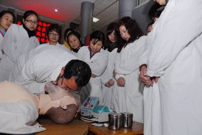 11月16日,武汉市江夏区藏龙岛湖北经济学院社区卫生服务中心的40多名医护人员在专家的指导下演练急救操作。该校邀请协和医院急诊专家樊红博士对校医院和社区医护人员进行急诊、急救操作技能培训,以应对社区师生和市民因各种因素造成的意外伤害和疾病事件。