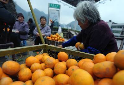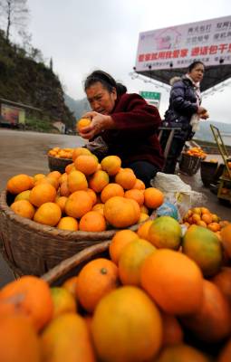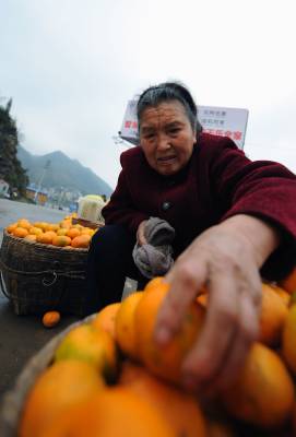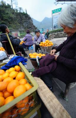 18日,老人们在途经宣恩县城的209国道旁出售橘子。时值冬季,农闲时的老人们带着自家产出的橘子进行零售,而每售出一公斤,比直接批发给中间商多收入0.4-0.6元,由此每天可增加几十到上百元不等的现金收入。据了解,宣恩县目前橘子种植面积近10万亩,是农民增收的重要经济来源。本报视界网宋文摄