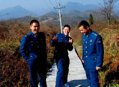 11月19日,广空某部巴东雷达站的官兵在当地修建的拥军路上摆造型拍照。巴东雷达站是全省驻军最艰苦的地方,为了方便这里的官兵,巴东县民政局、绿葱坡镇政府积极为驻军服务,今年先后投资20万元为官兵硬化了一条1.5公里的人行道,解决了饮水问题。田植峰摄