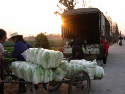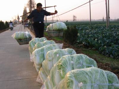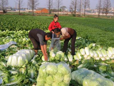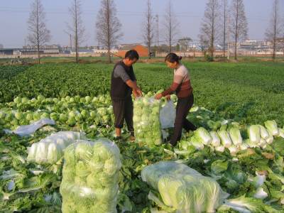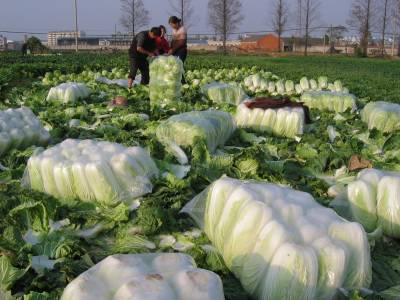 云梦大白菜丰收11月19日下午,湖北省云梦县城关镇肖李村村民收获大白菜。村民安恒雄介绍说,今年大白菜亩产7000多公斤,仅大白菜一项,亩收入4000元左右。云梦县是湖北省蔬菜生产大县、湖北省蔬菜标准化建设示范县、全国无公害蔬菜生产示范基地县,全县蔬菜常年种植面积12万多亩,复种面积30万亩以上,产量62万多吨。其中云梦生产的大白菜作为城乡居民”大路菜”,畅销武汉、河南等地,受到消费者的普遍喜爱。摄影:陈保忠