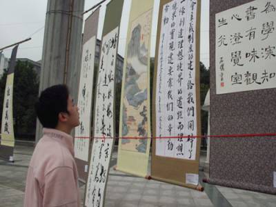 11月20、21日,由恩施市老年美影协会、湖北民族学院医学院书画社、恩施职业技术学院新风书画协会联合举办的”弘扬民族书画艺术,推动校园文化发展”书画展在湖北民院大学生广场和恩施职业技术学院举行。《祖国万岁》、《志存高远》等120余幅各类优秀参展书画作品展现出了大学生对中国传统文化的热爱及对祖国的美好祝愿。
