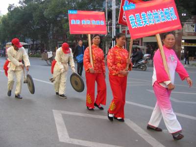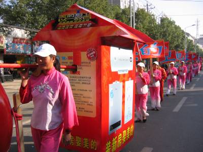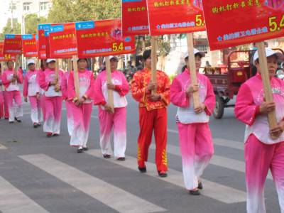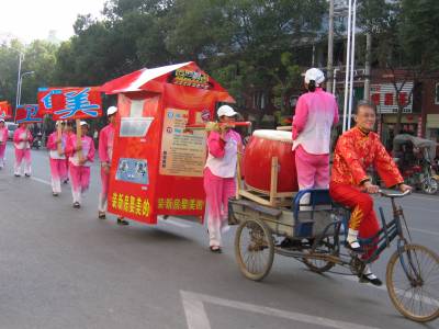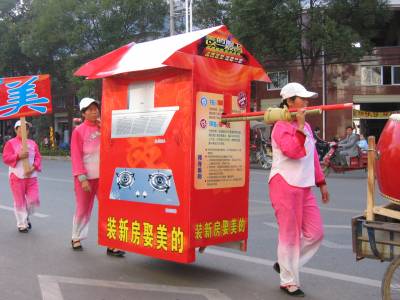 《云梦:”厨卫”坐上”大花轿”》2010年11月20日下午,一销售商别出心裁,将某品牌的”厨卫”坐上”大花轿”,其后跟上一支身穿艳丽统一服装的长长队伍,敲锣打鼓,行走在云梦县城梦泽大道上,吸引众多路人驻足观望。