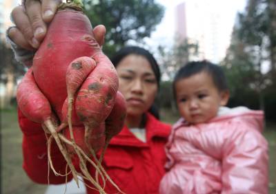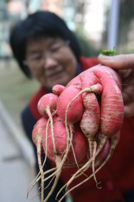 11月20日,家住湖北省襄樊市金龙陶瓷厂的潘友凤女士,在自家的菜园里意外拔起一个极为少见的17胞胎连体萝卜。据了解,这个一斤多重的红萝卜大大小小就有17个,它们紧紧抱在一起,像一个大家族大团圆一样亲热。农业专家解释说,蔬菜在生长的过程中,受种植环境、技术和温度的影响,可能会出现畸形的情况,这个萝卜在生长时主根可能受伤或者受到抑制,出现连体的现象。另外一个原因就是它在生长过程中营养充分发生裂变,养分集中在一起出现连体。农业专家称,这样的萝卜并没有危害,除了有较高观赏价值外,还是可以食用的。