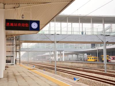 11月20日上午11时50分,由两列红色电力机车牵引、挂有18节各类车厢的客运列车缓缓驶进恩施火车站。当天我国施工难度最大、平均造价最高的铁路——宜万铁路开始进行客运试运行。在随后的几天中,客货运列车将同时在宜万铁路进行试运行。按计划,铁路将于本月底正式通车。 据了解,宜万铁路设计为国家一级电气化干线,东起宜昌的花艳,向西经长阳、巴东、建始、恩施、利川至重庆万州,最后与规划建设的渝万城际铁路相连。宜昌至利川凉雾的288公里设计时速是160公里,计划开行动车组,兼顾货运;凉雾至重庆万州的89公里属支线铁路,设计为单线,时速为120公里。