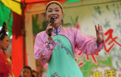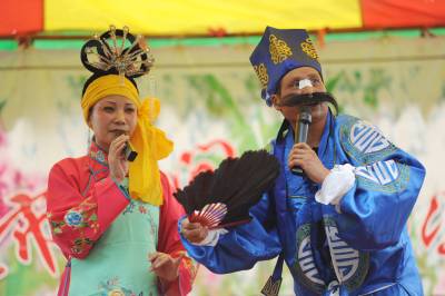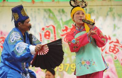 ”草根剧团”送戏进城21日,潜江市龙湾镇文艺工作者谢从明(1654右一)带领他的剧团演员在江陵县演出,演唱原生态潜江民歌。谢从明收集整理的潜江民歌《薅草情歌呀嗬嗨》、《郎在墙外叮瓦喳》等曾参加武汉市首届邻里文化节,武汉市东湖国际荷花节演出。该市大力扶持农村文艺剧团的创建,积极培植”草根剧团”。唱农家曲,演农民戏的”草根剧团”,如今,在潜江乡村遍地开花,他们不仅活跃在农村,也常常送戏进城为市民献艺。吴燕军金必祥摄