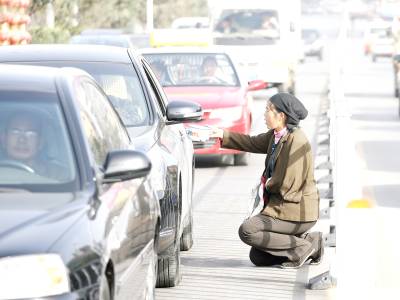 22日,一个妇女在荆门市象山大道马路中央给车上的司机下跪乞讨。不少市民见后表示担忧,如此乞讨既不安全,又影响城市形象。签约摄影师郑波摄