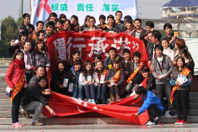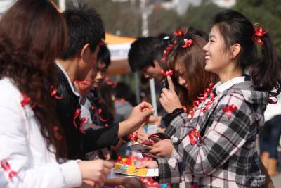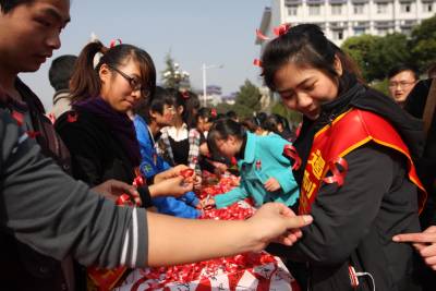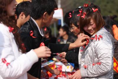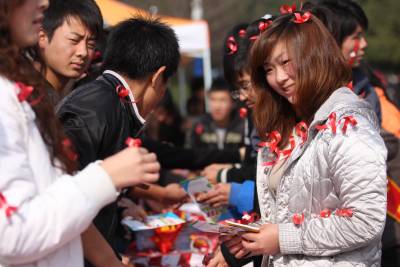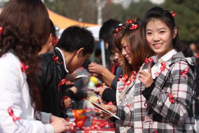 11月25日,一群防艾宣传员在给大学生贴红丝带。为迎接第23届世界艾滋病日的到来,湖北民族学院举办”遏制艾滋,履行承诺”主题宣传活动,活动中发放了5000余个红丝带、500份防艾宣传册并开展了万人签名活动,以此宣传预防艾知识。据悉,今年艾滋病日的宣传主题仍是”遏制艾滋,履行承诺”,副标题是”权益,责任,落实”。