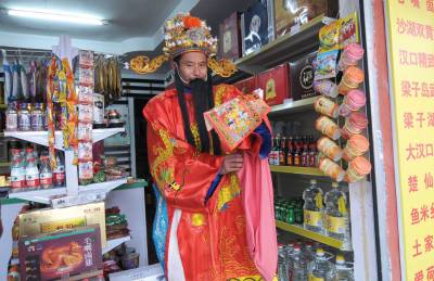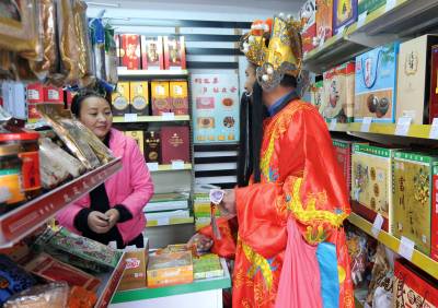 装扮”财神”来赚钱 28日下午,一名装扮成”财神”的中年男子在黄石大道红旗桥路段一商店送”财神画”后,正将店主给的赏钱放进”钱袋”。送一张”财神画”,叨咕几句恭喜发财,要几块赏钱,这是新年和春节之际一些人的”传统”赚钱模式。而我市的一些小商铺现在已开始遭到这些”财神信使”的”拜访”了。 做小买卖挣钱不容易,做买卖都愿图个吉利,如果不要他们的”财神画”又会觉得不吉利,可往外平白无故地掏钱,这又有什么吉利?这让人产生一种被要挟的感觉,心里难免堵得慌。”送财神”的人正是抓住人们这种心理来做自己的生意。据该男子介绍,他来自河南。图二:”财神”向店主讨要赏钱。黄石市黄石日报摄影部邱孝威摄电话;13807232603邮编:435002