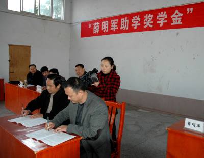 11月29日上午,以研发、自主生产整车品牌为SCOLERBIKE高端自行车和代理美国知名品牌WTB全系列产品的深圳市世高诺科技有限公司的总经理薜明军,在家乡湖北谷城县庙滩镇与镇教育部门签订协议:从今年开始,每年出资5万元设立”薜明军助学奖学金”,用以资助家乡的贫困学生读书。图为薜明军(右)正在签订协议。湖北谷城县城粉阳路33号(报社院内)帅瑜摄(邮编441700)