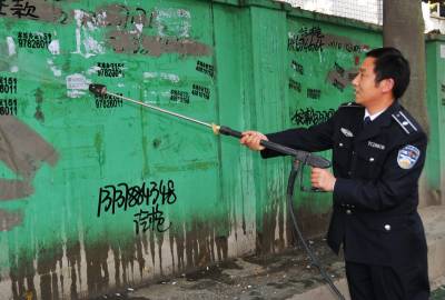 11月28日,湖北省郧县综合执法局城管大队队员利用高压水枪进行户外野广告清除工作,这是该局进行的为期一个星期的治理工作并以新的市容环境迎接2011年元旦,同时今年1至11月共处罚乱贴乱画野广告户主800余人。图为城管大队副大队长张瑛正在中心巷清除野广告时的情景。周家山摄湖北省郧县城管大队电话13872840078邮编442500