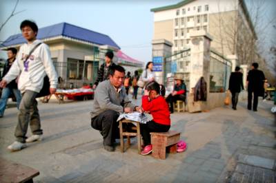 该照片拍摄于中南民族大学大学南三门,同时比邻中南财经政法大学西门。一个小商贩在生意并不忙碌的闲暇之余在自己力所能及的情况下辅导着自己幼女的课程作业。此照片的亮点在于是对中国当今教育机制的强烈质疑!外来务工人员的子女上学问题应该被社会予以重视!