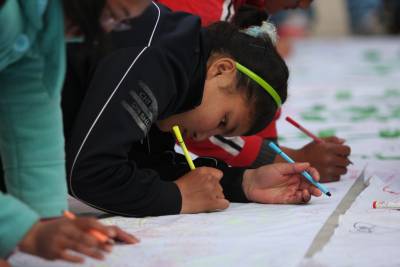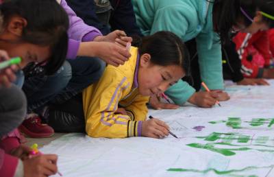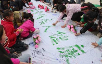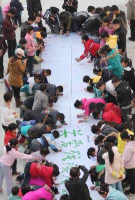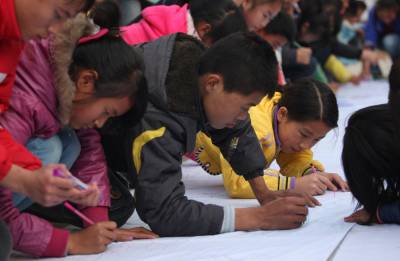 12月2日,恩施市特殊教育学校的学生正在写有”关爱残疾人健康”的横幅上亲手绘出自己的美好心愿。在”国际残疾人日”到来之际,湖北民院的大学生志愿者走进恩施特校,为残疾儿童送去了手套和学习用品等,并和学生们在横幅上画画,写下了美好的祝福。本报视界网陈地长通讯员余先静摄