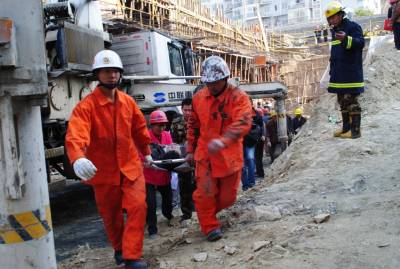 3日上午11时许,十堰市北京路博物馆旁边的一处施工工地突然发生坍塌,两名在坑内工作的民工被埋压。该市消防支队特勤中队10名官兵迅速出动消防指挥车、抢险救援车火速赶赴事故现场施救,最后成功救出两人。目前,两民工暂无生命危险。(本报视界网徐雁初、朱友君摄)