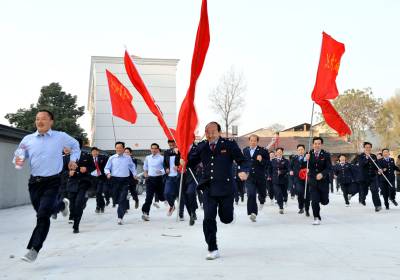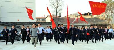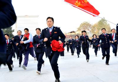 2010年12月3日上午,登山队员们手持队旗奋力奔跑。当日,湖北省南漳县国税局举行了”全员健身”团队登山竞赛活动。来自局机关、城区分局、武镇分局、东巩分局和稽查分局五个代表队的百名税务干部参加集体登山竞赛活动。据举办方介绍:举行这一活动,旨在培养全体干部的团队精神和大局意识,让每一位税务干部拥有健康的体魄。