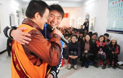 与在押人员同唱一首歌12月4日,黄石市理工学院50多名青年志愿者来到该市第三看守所,与这里的在押人员进行联欢,共同度过第十个”法制宣传日”。据了解,看守所的在押人员与青年志愿者年龄相仿,在人生的道路上误入歧途。为帮助和鼓励他们改过自新,树立新的人生观,志愿者们为他们送来励志书籍及书法作品,还与他们共同表演节目。图为一名志愿者把授带戴在在押人员身上,并高兴地与他同唱一首歌。黄石市黄石日报摄影部邱孝威摄电话:13807232603邮编:435002