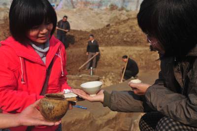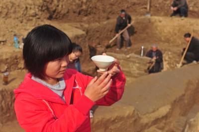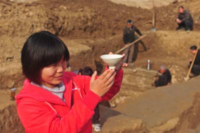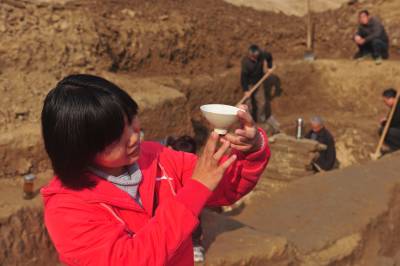 12月5日,湖北省襄樊市文物考古研究所考古硕士易珊珊在向记者介绍刚刚出土的北宋瓷器。湖北省襄樊市考古人员在位于襄樊市襄城区檀溪路的溪苑实业总公司一建筑工地发掘宋墓葬群。发现墓葬16座,在一座墓葬中出土了精美的瓷碗、瓷粉盒、瓷罐,并且出土了宋真宗咸平、景德铜钱,可以确定墓葬的准确年代为公元998年至1007年间的墓葬,年代非常精确,考古专家认定,这个墓葬出土的瓷器是判定北宋初期瓷器的标尺性文物。