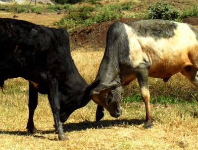 2日,两头小牛干起架来了,你进我退,互不相让,直到主人用鞭子把它们打开。视界网签约摄影师周剑锋摄于埃塞俄比亚高原