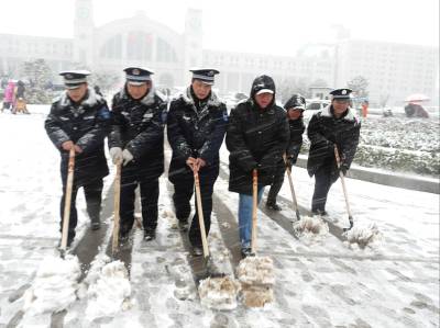 2011年1月2日早上湖北武汉喜降瑞雪。江汉区汉口火车坫综合管理办公室城管、公安等部门执法人员,顶风冒雪在汉口站前广场上扫雪、洒盐化雪、铺垫麻袋,方便南来北往旅客安全出行。