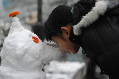 新雪的味道2011年元月2日,在宜昌市城区欧阳修广场公园,一名小女孩正在和一个刚刚堆好的雪人儿亲密接触,嗅一嗅新年第一场雪的味道。据了解,今年元月是湖北省冬季最冷的一月,受北方冷空气不断扩散南下影响,在元旦节期间全省自西向东有小到中雪,局部大雪,日最低气温大部地区零下5℃至零下1℃,有冰冻天气发生,需防范强降温、低温雨雪冰冻和大雾天气。