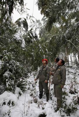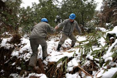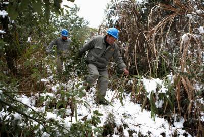 1月3日,湖北咸宁供电公司输电中心员工在巡查输电线路,确保武广高铁和京广铁路运输大动脉的畅通。1月2日起,一场低温降雪由北向南横扫华中地区,湖北大部分地区气温降至零下3℃。为确保湖北电网的安全稳定供电,湖北省电力公司启动应急预案,出动5000余人加强输配电设施的巡查和维护,全力保障电力的有序供应。