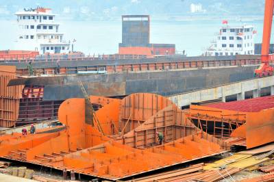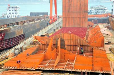 新年伊始,湖北省宜昌市夷陵区乐天溪镇三峡移民生态工业园”沿江船舶建造小区”一片红火,工人正在加紧建造大型滚装船。 2010年,乐天溪造船小区实现产值15亿元,建成载重1万吨级船舶4条、0.6万吨级船舶32条,共有825名三峡工程移民在造船小区打工就业。 据悉,宜昌除了乐天溪造船基地,还有黄柏河、庙南、清江等造船厂以及长航宜昌造船厂和葛洲坝造船厂,长江沿线宜昌段造船业呈现红火一片景象。本报视界网张国荣摄