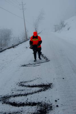 1月5日,巴东县绿葱坡公路管理站的工人在冰雪路上学术洒防滑碳灰。绿葱坡公路管理站是全省海拨最高的公路管理站,辖区有国省道80公里,15名工人长驻守在海拨1600米经上的高山地区,护送过往车辆通行。田植峰摄