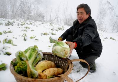 1月5日,湖北恩施宣恩县珠山镇东门关村7组村民熊红国忙着采摘被大雪冰冻过的蔬菜。据了解,1日以来的大雪,使宣恩县2万多亩蔬菜受冻。乘雪停下来的时候,菜农们纷纷抢摘受冻的蔬菜,及时卖给客商。目前,该县农业部门正积极组织人手,对农民进行技术宣传指导,帮助菜农降低损失。