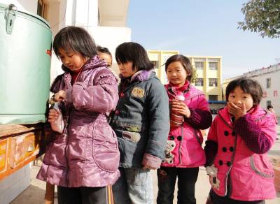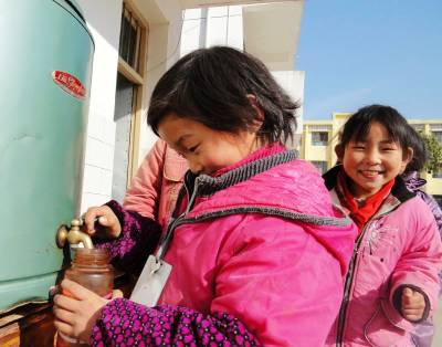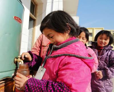 进入寒冬以来,郧县积极做好学生在校的防寒保暖工作,郧县教育局要求各学校一定要让学生有开水喝、寄宿生有热水洗。图为1月6日上午,郧县刘洞镇九年一贯制学校的学生们拿着水杯、暖水袋在排队打开水。(郧县刘洞镇九年一贯制学校高超/摄)