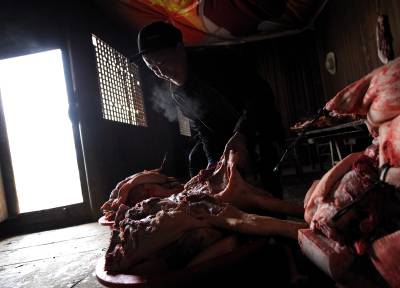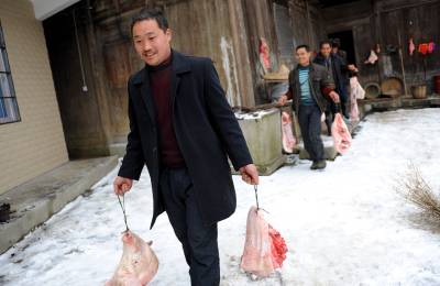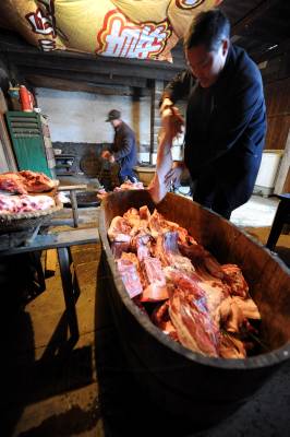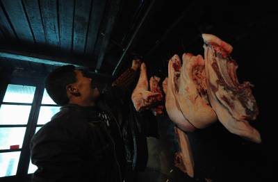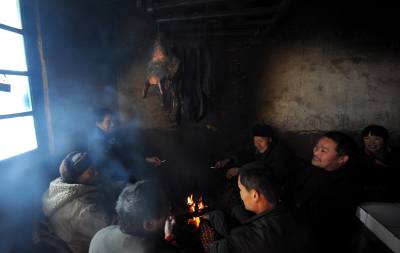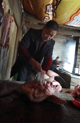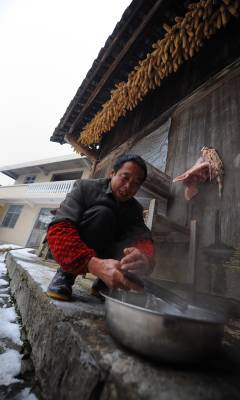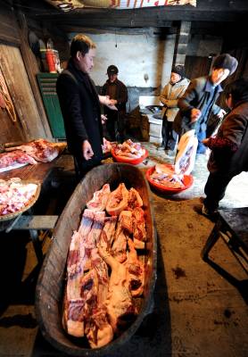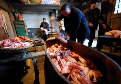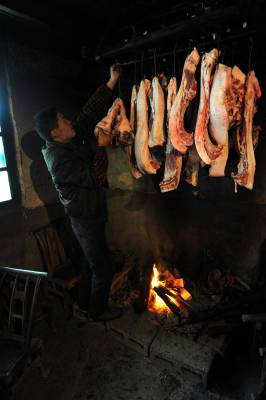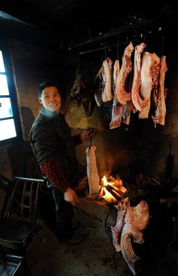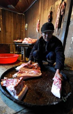 1月6日,宣恩县珠山镇界直岭村农民在腌制”土家腊肉”。腌制”土家腊肉”是恩施土家族苗族自治州农村过年内涵的重要组成部分。进入腊月后,农民们便请来屠夫,将一年来辛苦养大的肥猪宰杀,并分割成块,撒上食盐等作料后码放一两天,然后挂在炕上,任凭烟熏火烤。在困难时期,农民能杀上一头年猪在当地农村是一件十分”风光”的事,并邀约亲朋好友一同”吃刨汤”(土家风俗,即在杀猪当天吃新鲜猪肉)。改革开放以来,当地农村发生了翻天覆地的变化,每户农户每年至少能杀一头年猪,而”吃刨汤”的风俗也一直保留至今,因此每逢腊肉,农民相互之间相互串门,也就有了吃不完的”刨汤”了。亲朋好友在杀猪当天大吃一顿之后,农民会将余下的猪肉进行腌制。原来腌制的腊肉主要供自家在来年栽秧、薅草等重大农事活动中食用,而如今除了自食,”土家腊肉”已成为众多山外游客到恩施后的必尝之物。于是,众多恩施农民在恩施火车、高速相继开通后,把”土家腊肉”的俺制作为商机进行把握,借此也让更多进入恩施的山外游客能够一饱”土家腊肉”的口福。本报视界网宋文摄