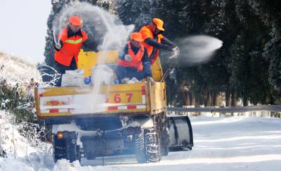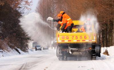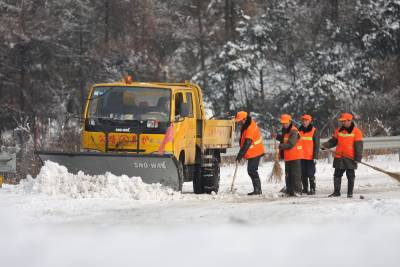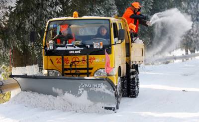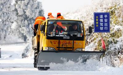 1月6日,在海拔1800米的湖北恩施巴东县绿葱坡路段,养护工人边铲除路面积雪边撒融雪剂。连日来,湖北省恩施州境内出现大范围低温雨雪天气,国道省道高山路段被厚厚的积雪覆盖。为确保道路交通安全畅通,该州公路部门对公路桥梁、陡坡以及重点路段进行了扫雪防滑处理,保证过往车辆有序通行。