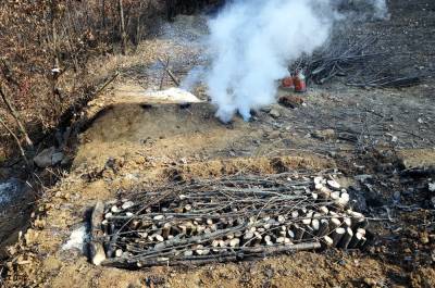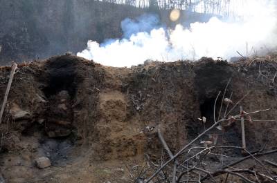 1月8日,笔者在湖北省郧县青曲镇周家坪村发现对面山上有烟,疑是起了山火,爬上山腰一看原来是一座烧炭窑在冒烟,右面的窑也己装满了锯好的桦柳树。郧县是水土保护的长防林地区,也是南水北调中线工程的核心水源区,多年以前早己明令禁止毁林烧炭,但由于今冬遭遇寒流,木炭2元钱一斤,一些农民在山林里开始悄悄的毁林烧炭,希望有关部门严加管理,保护南水北调中线工程的核心水源区的森林资源。图一为两座炭窑火口。图二为右侧的炭窑已装满了锯好的桦柳树。图三为冒烟的炭窑老远就看的见。如果刊用请一定使用笔名:肖州摄周家山湖北省郧县城管大队电话138728400787邮编442500