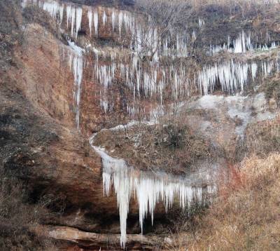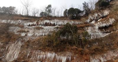 随着近日的持续低温,1月8日,郧县刘洞镇飞虎崖出现垂冰如瀑的壮观景象。悬崖上共有三处垂冰悬挂,密密麻麻,成千上万,最长的垂冰达到4.2米,崖下堆积了许多被游人打落的断冰,粗的赛过盆口。(郧县刘洞镇九年一贯制学校高超/摄邮编442525)