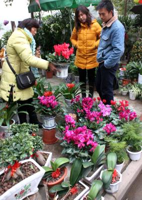 浴”雪”花卉俏争春8日,市民在花卉市场选购鲜花。随着春节的临近,潜江花卉市场日渐红火,降雪前后,当地花卉种植经营户积极做好花卉防冻保暖工作,增加象征新年吉祥寓意的新品种花卉满足客户需求,并开展流动销售和花卉出租业务,抢占春节市场。吴燕军