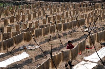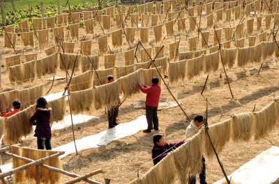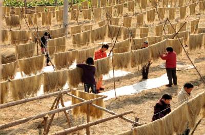 1月9日,郧县茶店镇长坪村村民们正在晾晒红薯粉条。素有”红薯之乡”的郧县,当地农民发挥传统手工加工红薯粉条的优势,将收获后的红薯精加工成粉条增值,带动了3万余农民大幅增收。目前,加工的粉条产销两旺,已形成规模,畅销鄂、豫、陕10多个省市和地区。 程复华 摄442500郧县国税局
